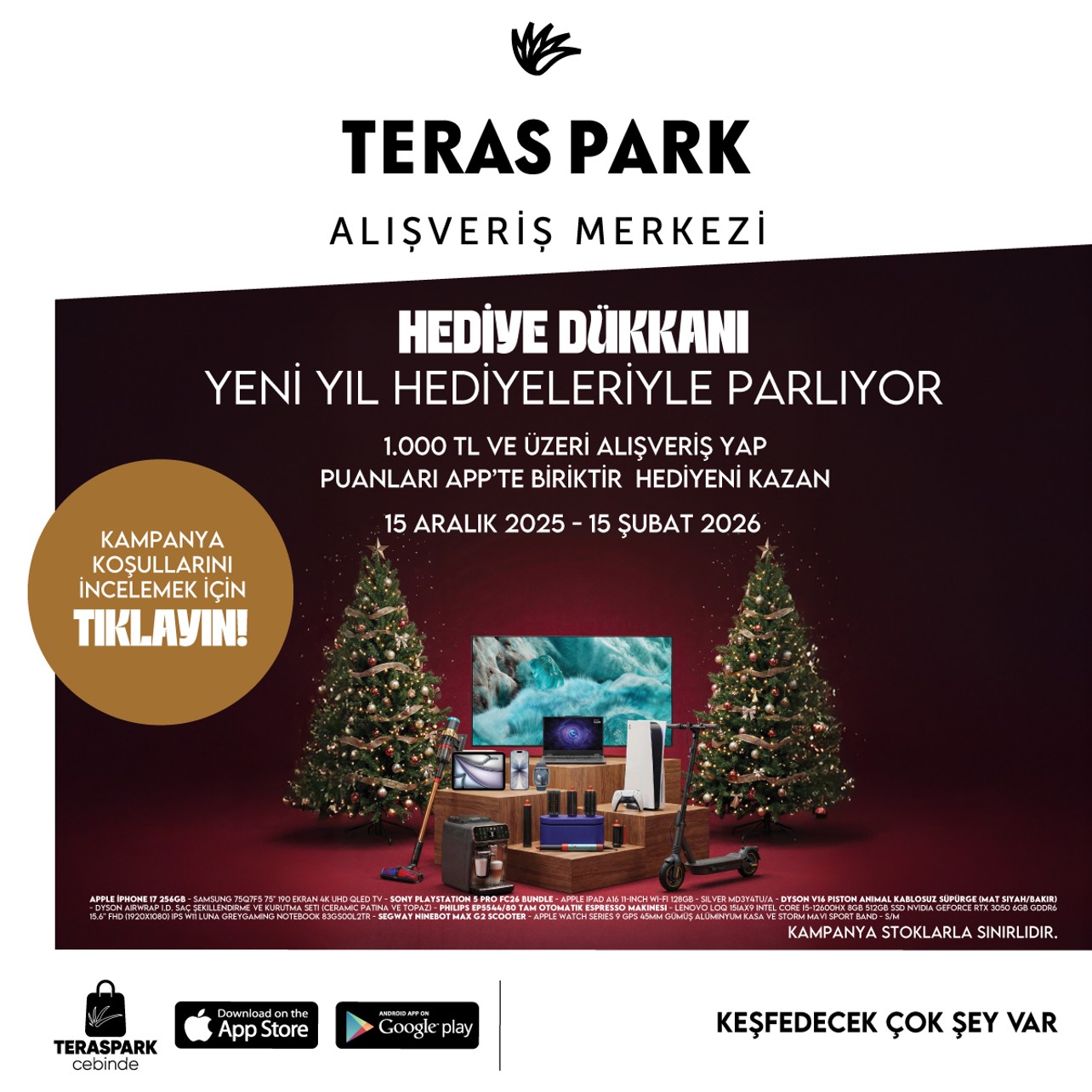 • Kampanya 15 Aralık 2025 – 15 Şubat 2026 tarihleri arasında, Teras Park AVM’den tek seferde yapılan 1.000 TL veya üzeri alışverişlerde geçerlidir.